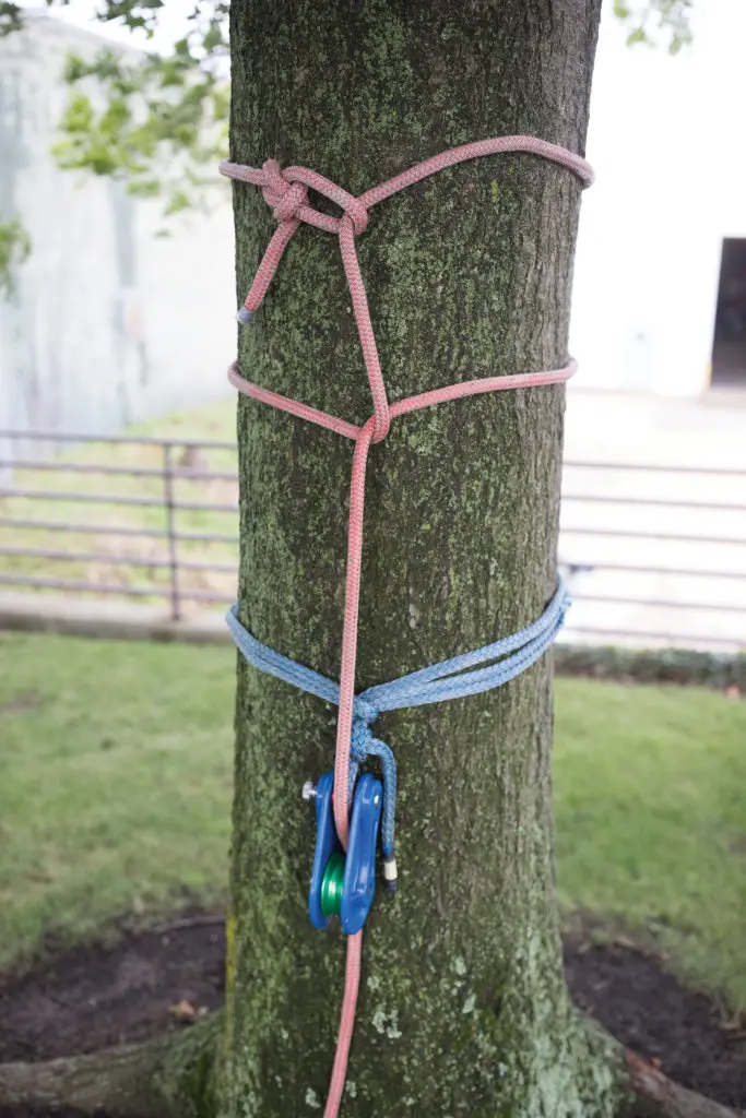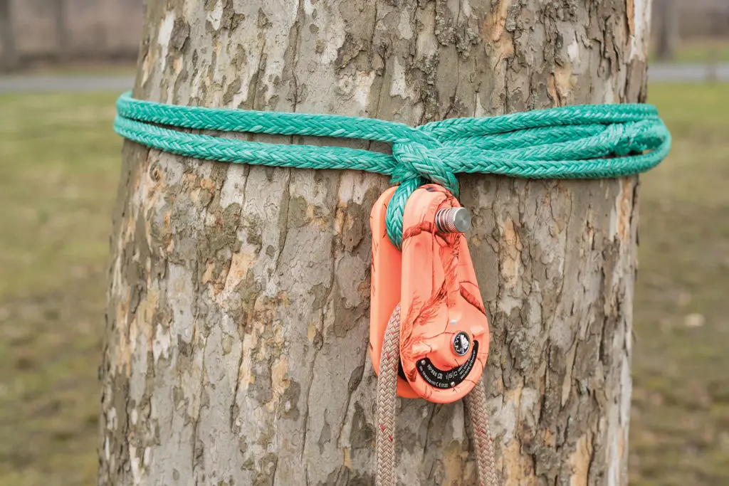 Remember to attach the block/pulley as close to the tree as possible, especially in negative-rigging scenarios. A pulley attached too loosely allows dramatic directional changes to forces applied at the point of attachment.