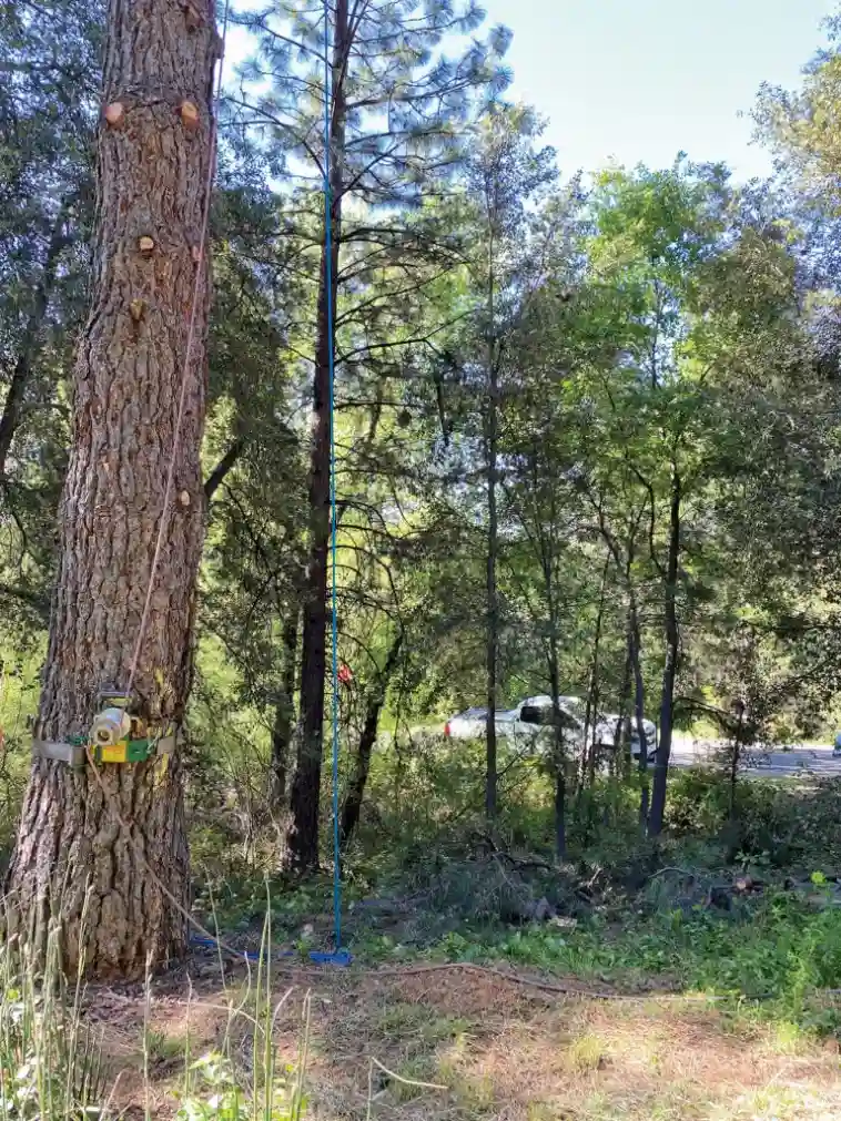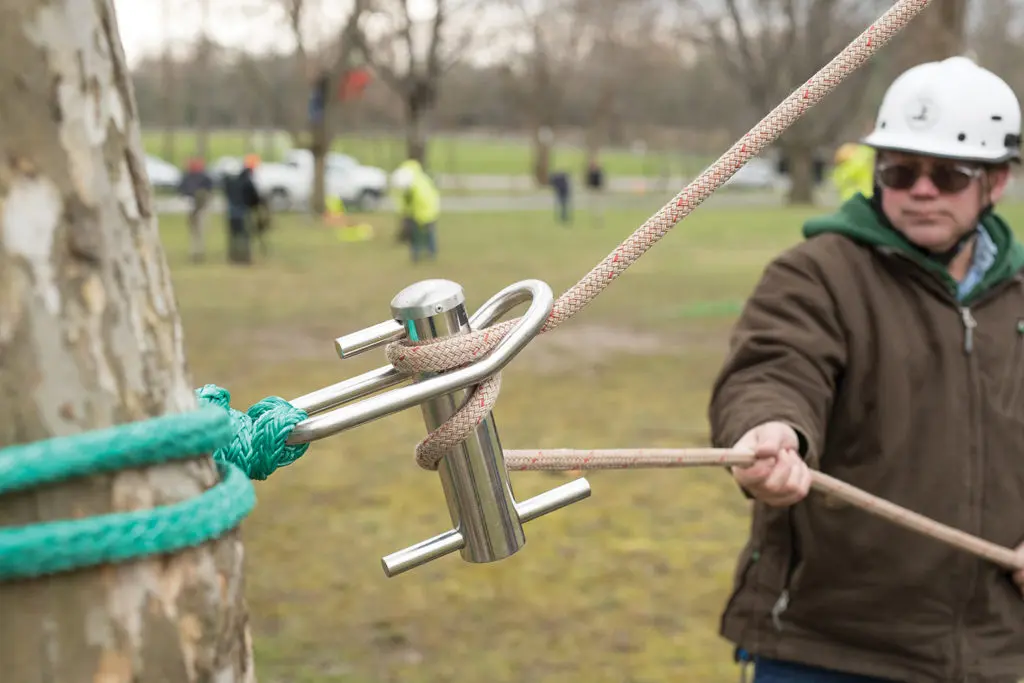 Setup is for large removals and dynamic loading forces (top-down rigging requires this setup no matter the tree size). The device operator must cut in a notch for the Hobbs device to set securely into the trunk wood. Now the weight rating is 3,000 pounds WLL (including dynamic forces).